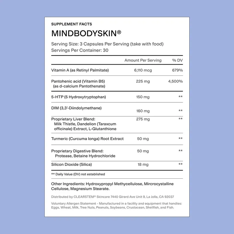 This comprehensive supplement designed to address hormonal acne targets multiple root causes simultaneously. It combines digestive support, liver detoxifiers, and hormone-balancing elements with mood support to reduce stress, PMS acne, and excess oil. MINDBODYSKIN® is the #1 bestselling acne supplement on the market, developed by The Acne Guru® to: → Fight hormonal acne at its root* → Help reduce stress hormones* → Reduce acne and breakouts*